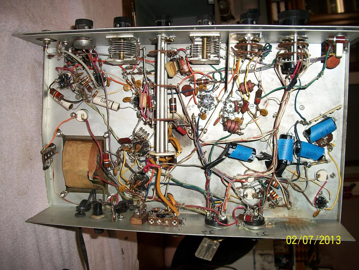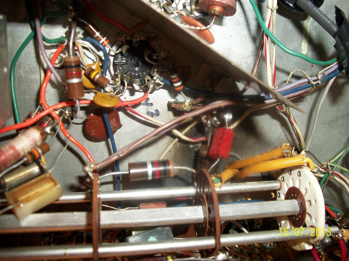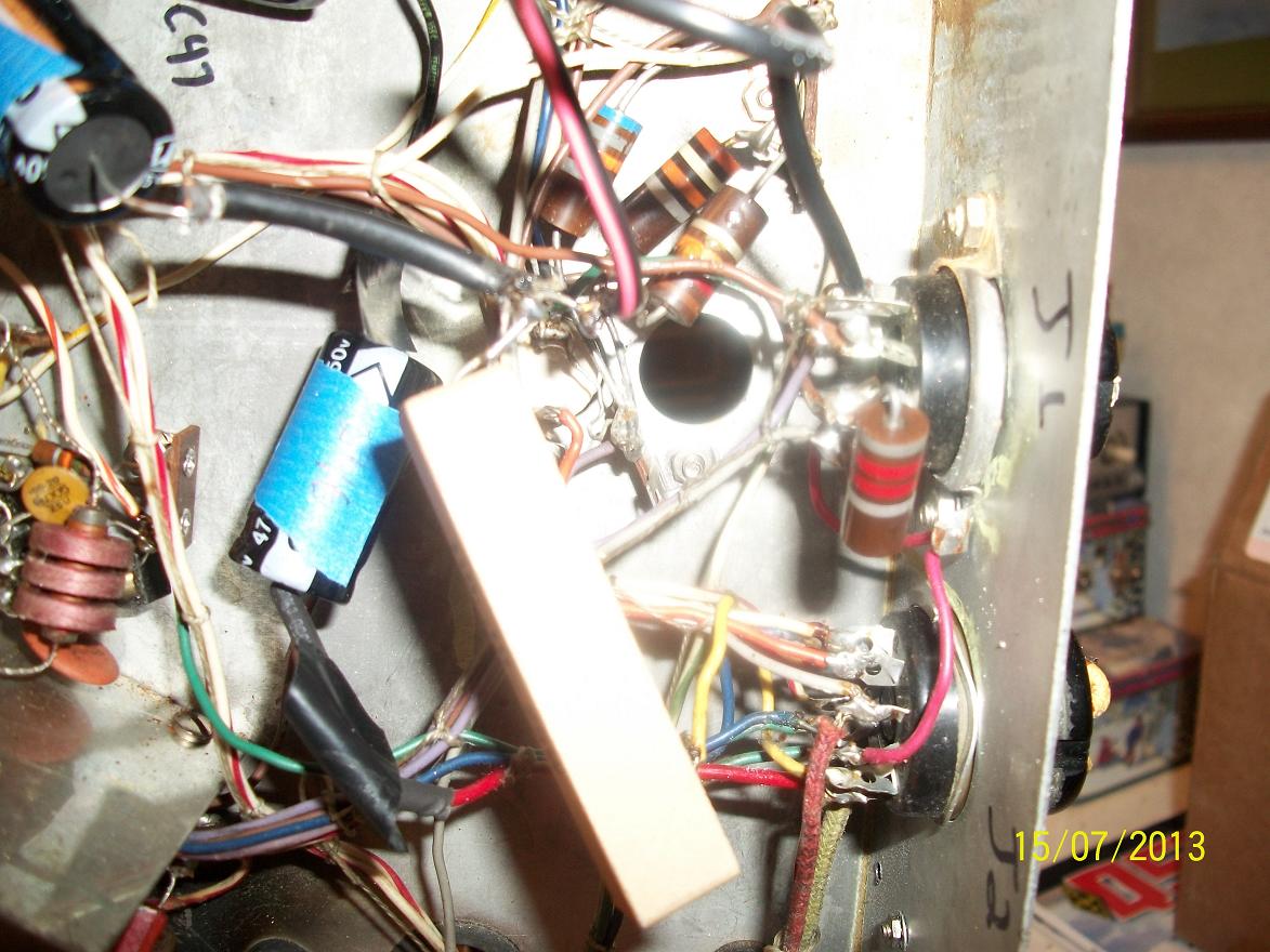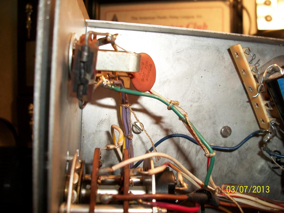Notice the burn spot (most likely from the can cap shorting) near the back of the band switch, and a piss poor attempt to replace the can cap in the power supply.