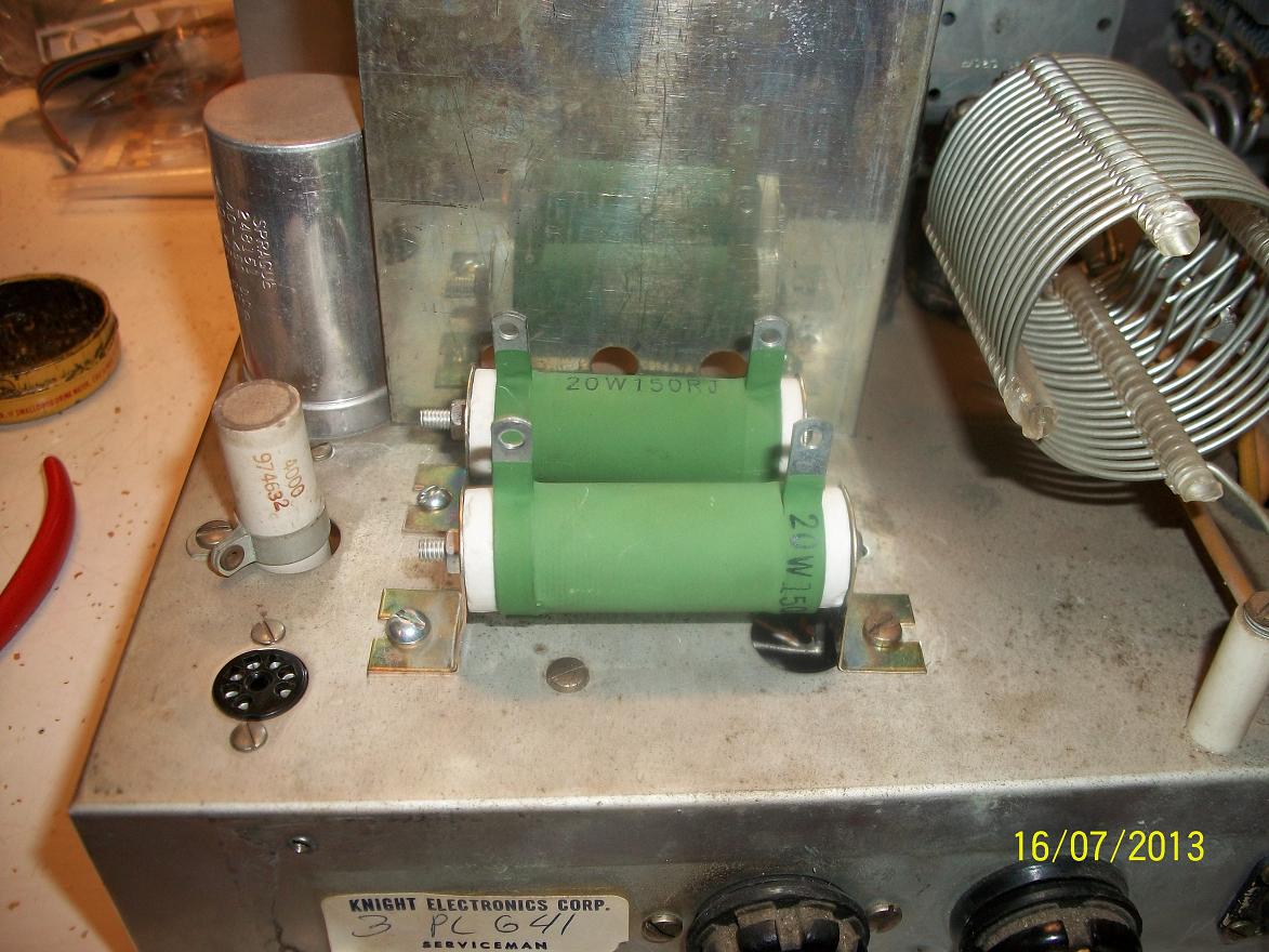 So off to the internet and some part shopping. At this point I only needed a 2.2K[3W resistor, a 2.2K\2W resistor, and I decided to replace both 150\20W resistors. I also noticed that near the rear of the band selector where the burnt area was, ran R10, a 10\3W resistor. I decided to replace it because it fed right to the plates of the 6146's.